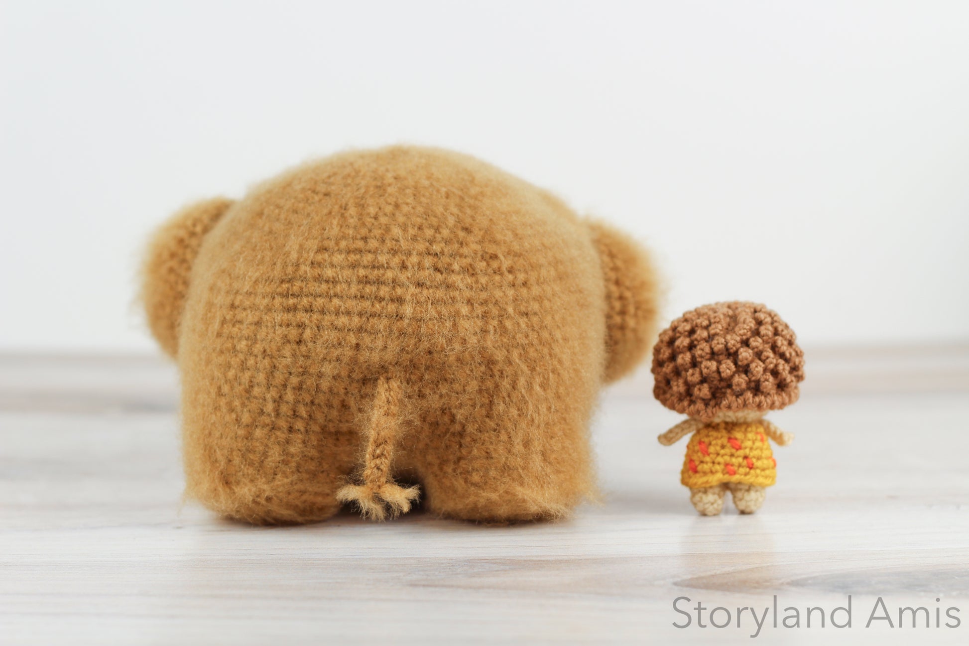 Finished mammoth measures about 8 in. (20 cm) long & 4.5 in. (10 cm) tall. Caveboy measures 3 in. (7.5 cm) tall. (Please be aware that depending on your gauge and the type of hook and yarn you decide to use, your mammoth and caveboy may not be exactly the same size as the one in the pattern.)